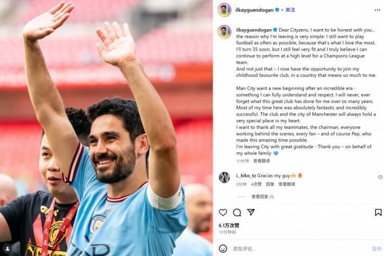 京多安社媒告别曼城:完全理解换血决定,坚信自己仍能在欧冠发光